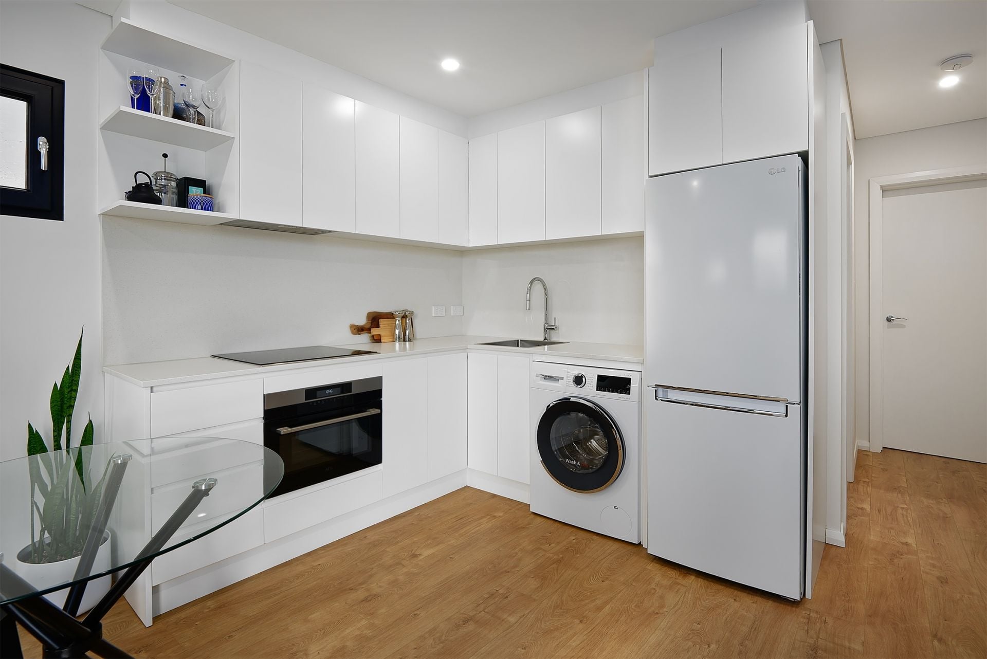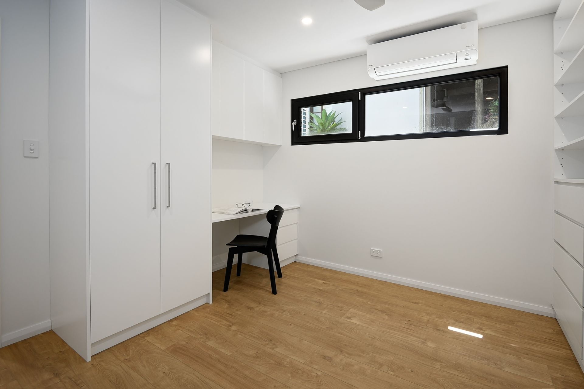The bedroom is thoughtfully designed with a Murphy bed and a dedicated study area, making the space flexible for working from home or relaxing. The gourmet kitchen is fitted with stone benchtops, ample storage, modern appliances, and a built-in washer-dryer—ideal for those who love to cook and entertain.