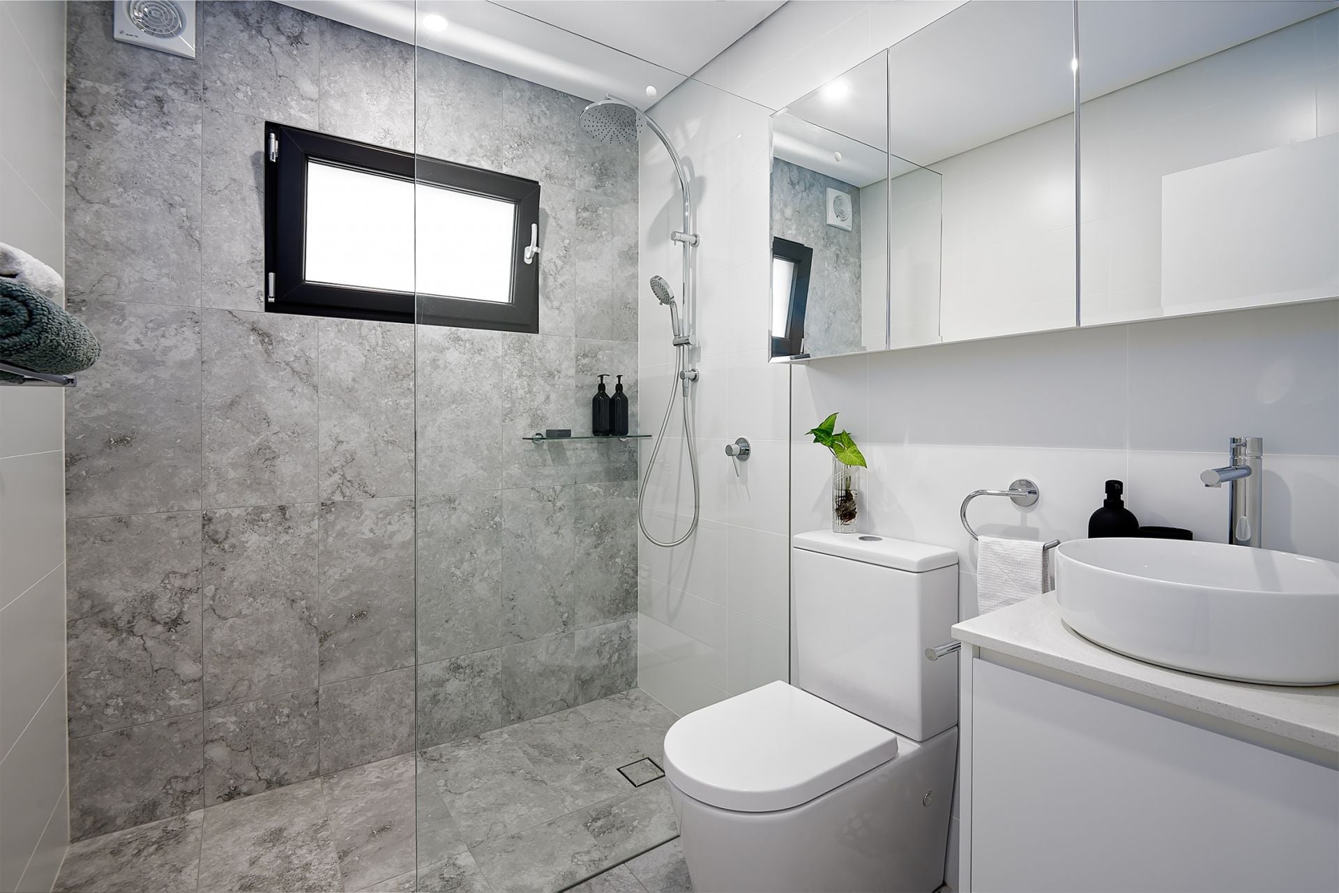 The open-plan lounge and dining area is beautifully furnished, including a lounge suite, dining table, and large TV, creating a comfortable and functional living space. The sleek bathroom boasts a rainwater showerhead and mirrored cabinets, combining luxury with practicality.