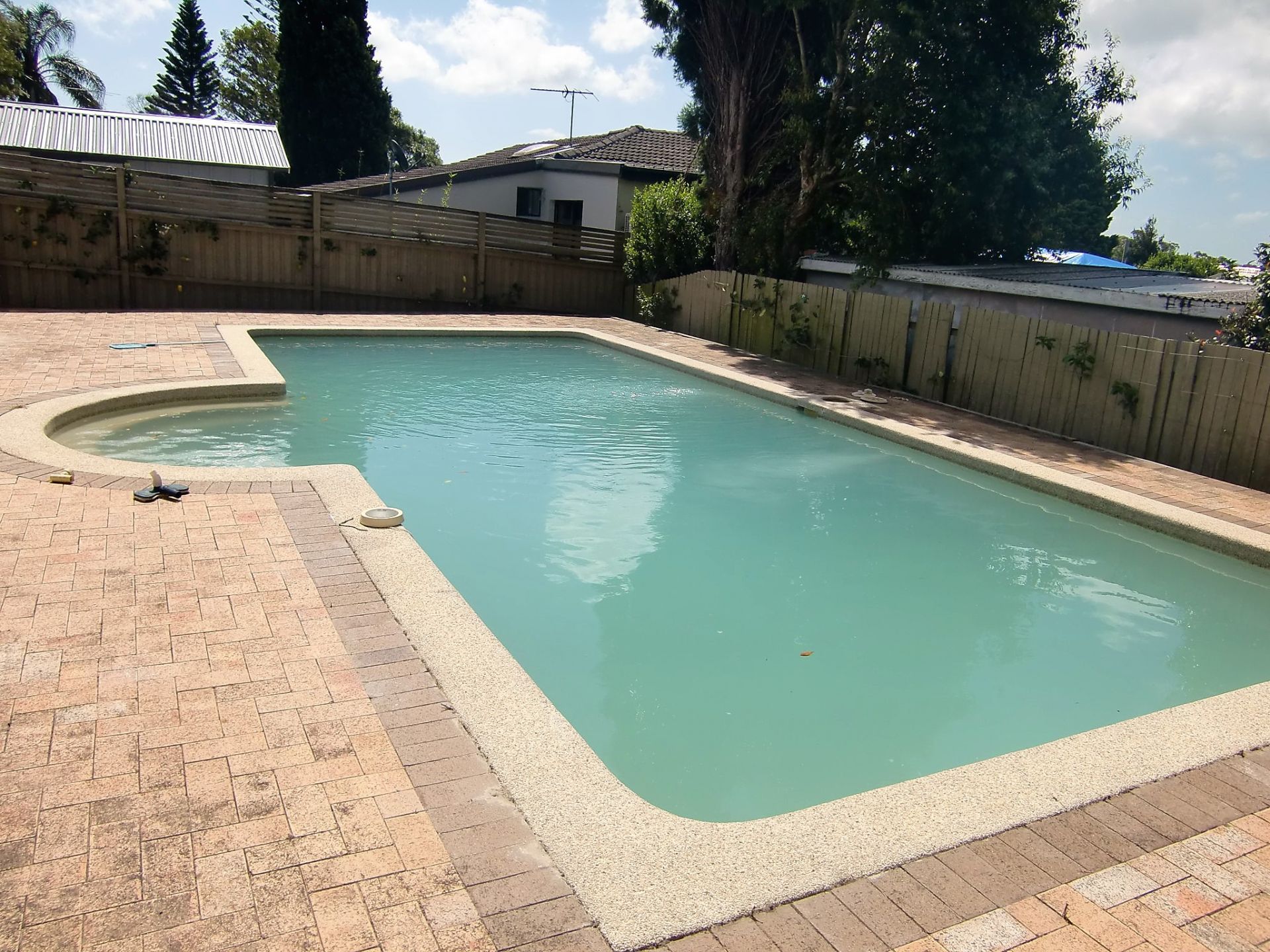 The kitchen overlooks the paved rear yard and large pool area