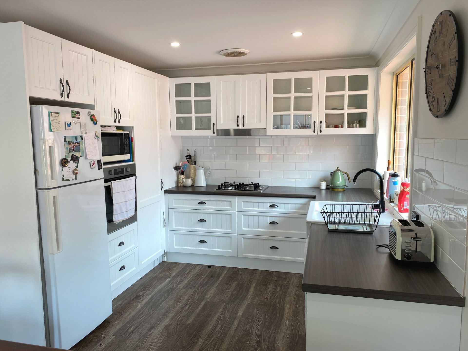 Stylish renovated kitchen with stain-less steel appliances, gas stove top, and ample bench space.