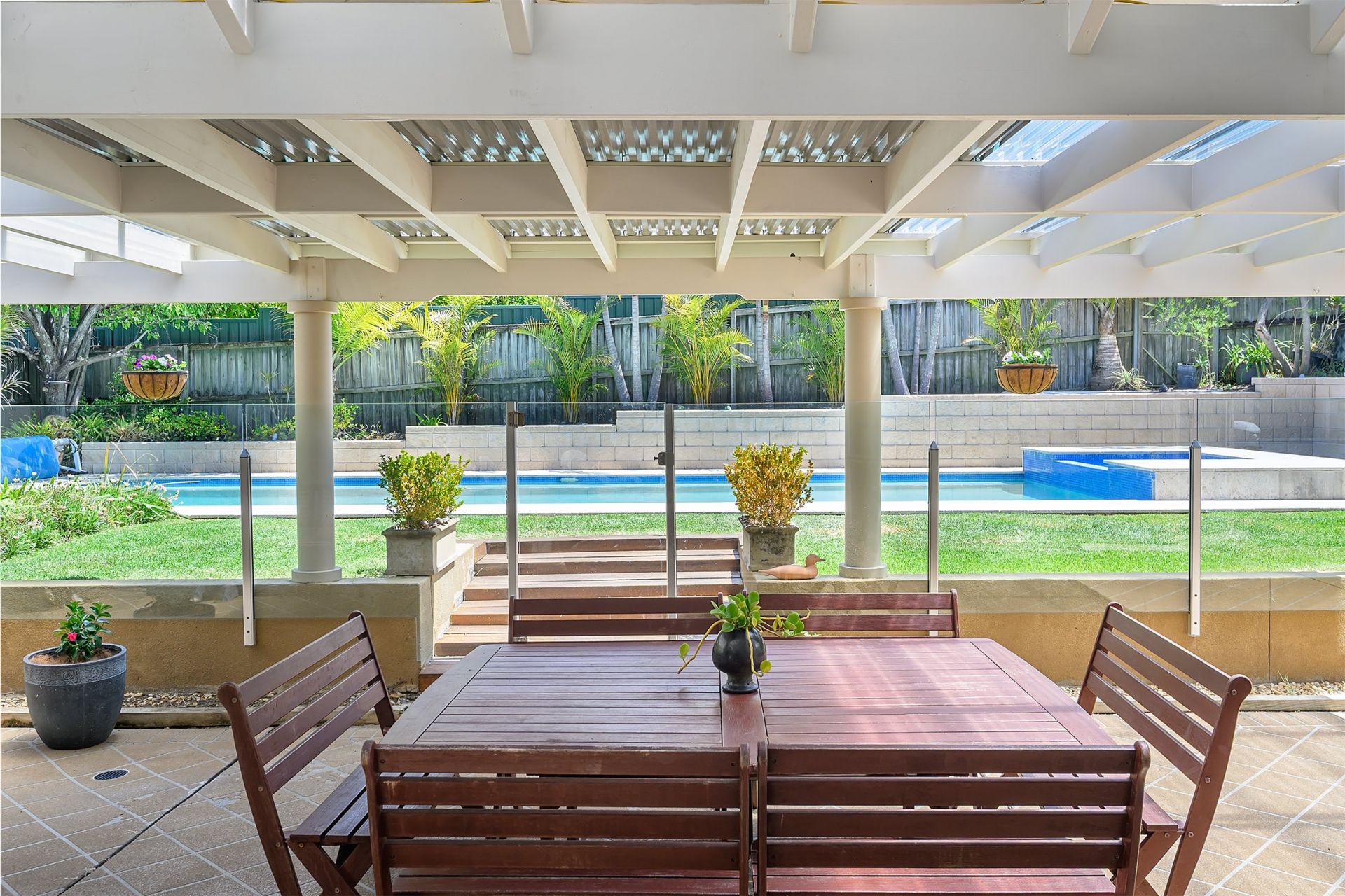 The covered outdoor area is a true highlight, featuring a pizza oven, barbecue facilities, and generous seating — the perfect setting for hosting family and friends. Surrounded by lush tropical gardens, the gas-heated pool and spa create a private, resort-style escape (serviced fortnightly in summer and monthly in winter). A fire pit adds to the ambience, creating a magical setting for relaxed evenings.