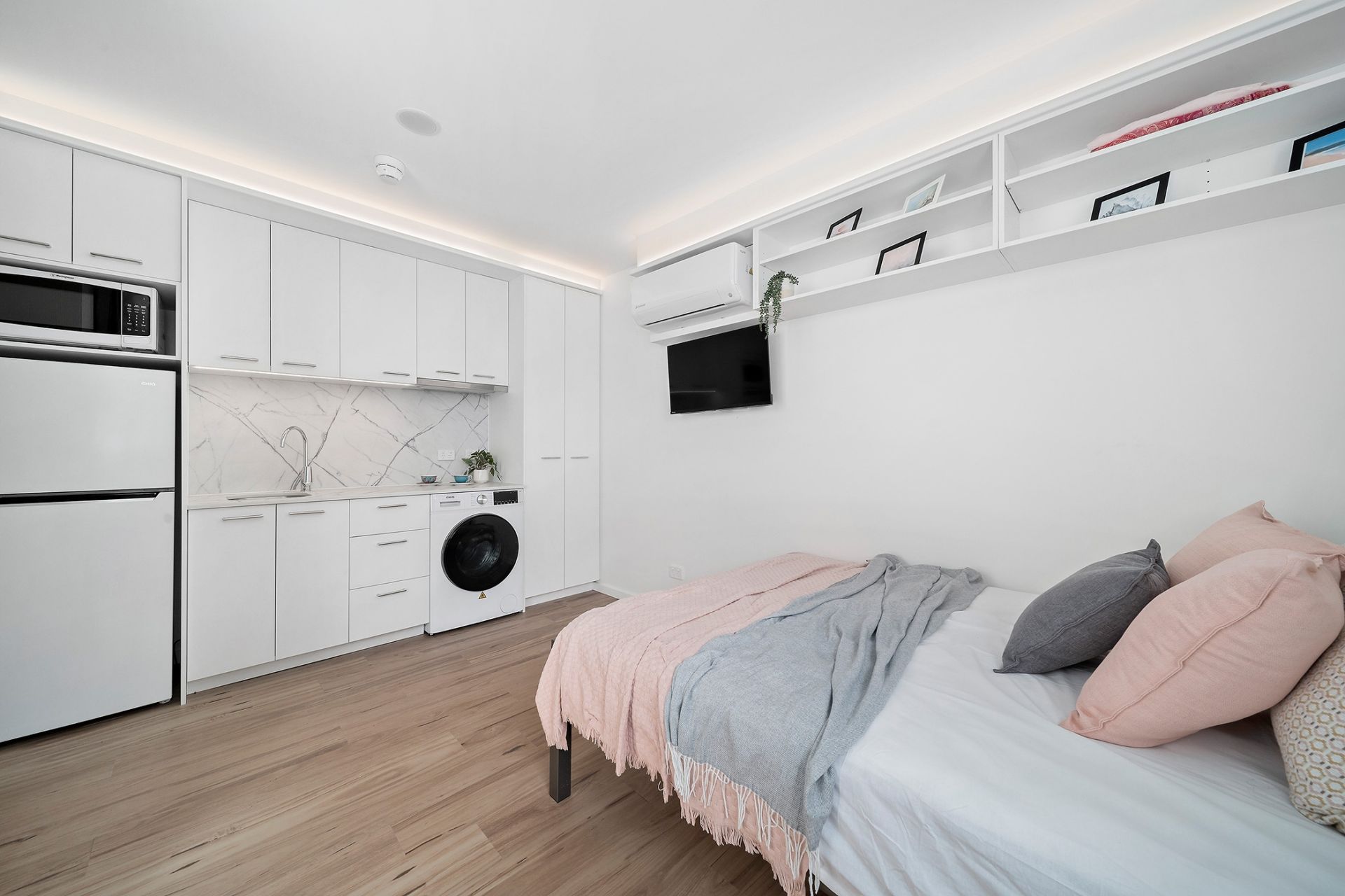• Modern kitchenette with premium stone benchtops, induction cooktop, microwave and fridge