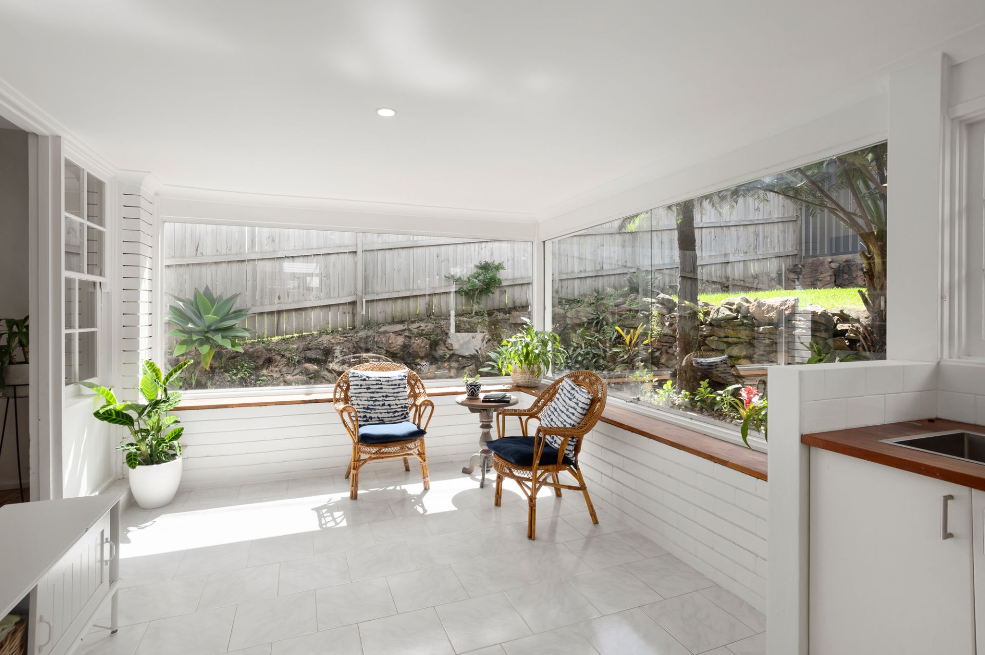 The tiled sun-room captures early morning sun and creates the ideal place for coffee and the Sunday papers or a kids play room