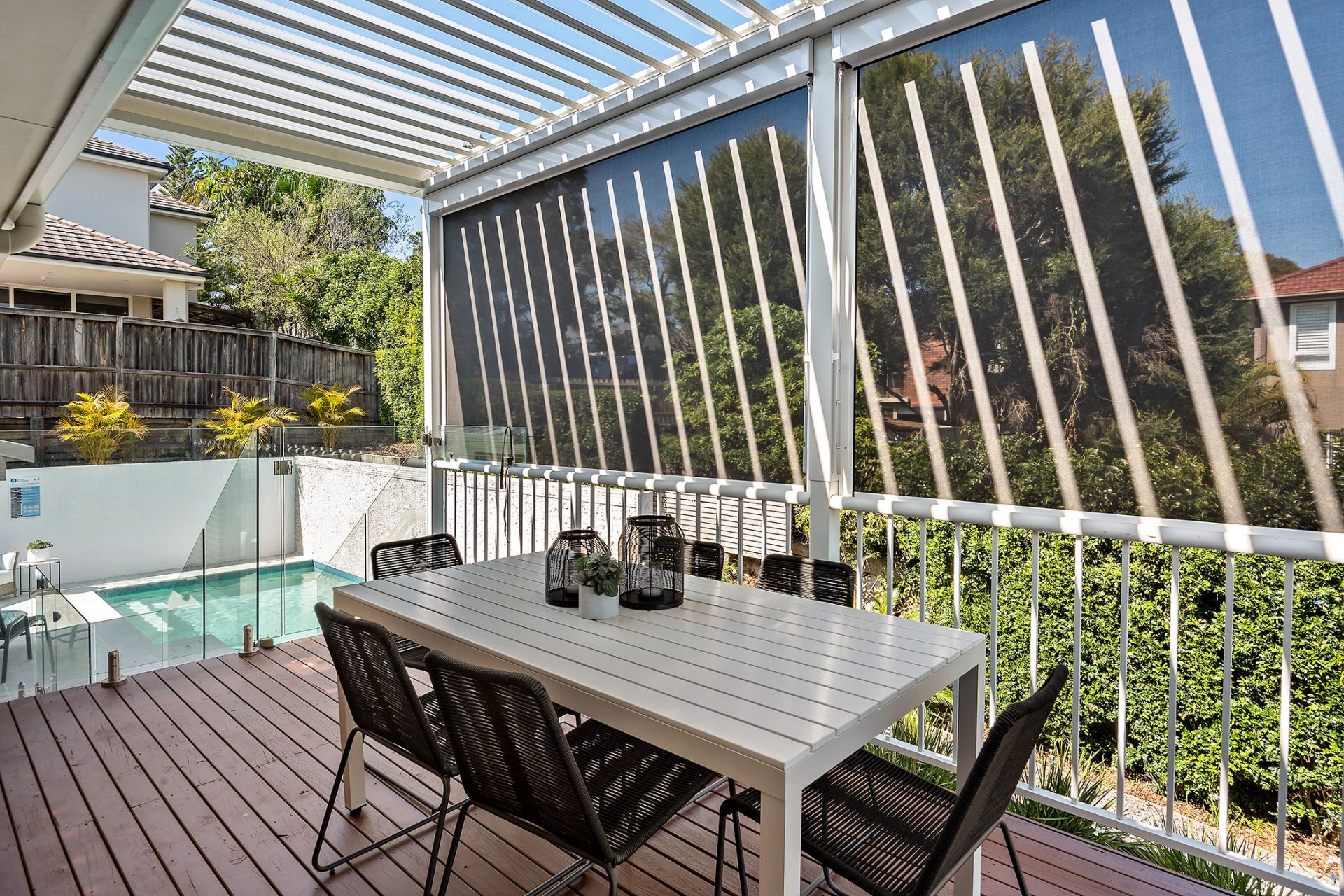 * Expansive pool area with water feature and glass fencing